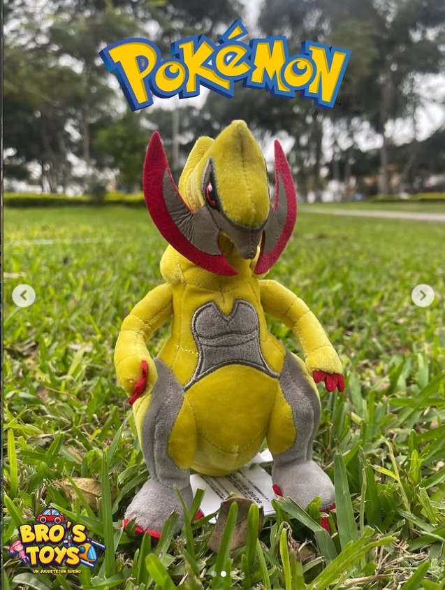El peluche reproduce con gran fidelidad los rasgos más distintivos de este Pokémon: su cabeza amplia, los grandes colmillos en forma de hacha, su cuerpo musculoso y los colores característicos que lo hacen fácilmente reconocible. Está elaborado con materiales suaves al tacto y costuras resistentes que permiten conservar su forma y durabilidad con el paso del tiempo.