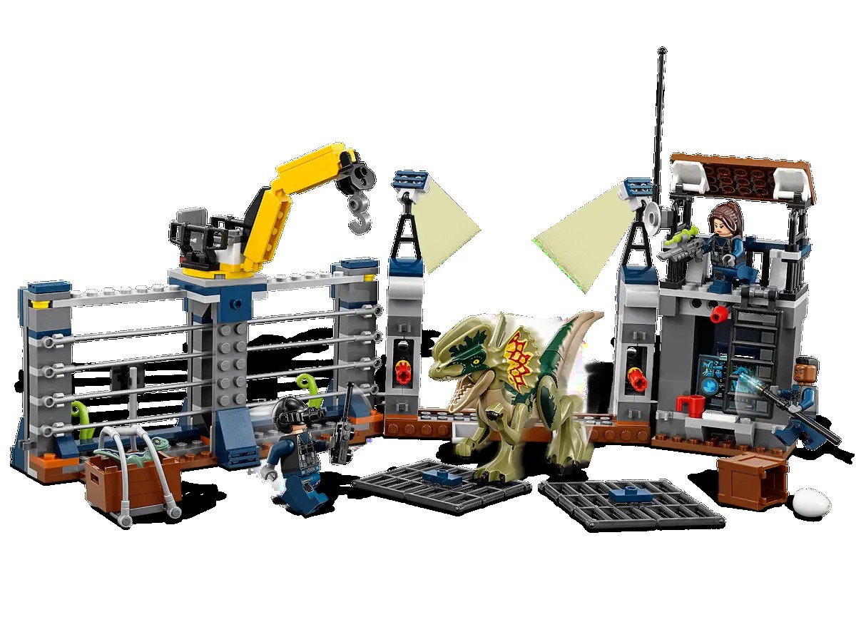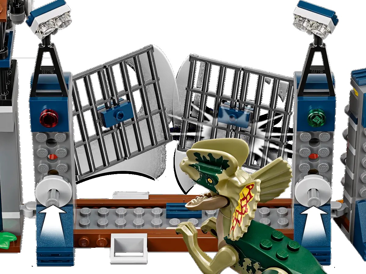 Ayuda a los cazadores a defenderse del feroz ataque del Dilofosaurio con este divertido set basado en Jurassic World™. Baja de la torre de vigilancia y la grúa, equipadas con funciones de explosión de la puerta y el muro, una caja y un bebé de Dilofosaurio, y usa el arma de dardos tranquilizantes para impedir que el Dilofosaurio atraviese las vallas. Este set de dinosaurios incluye 3 minifiguras y 2 figuras de dinosaurios.