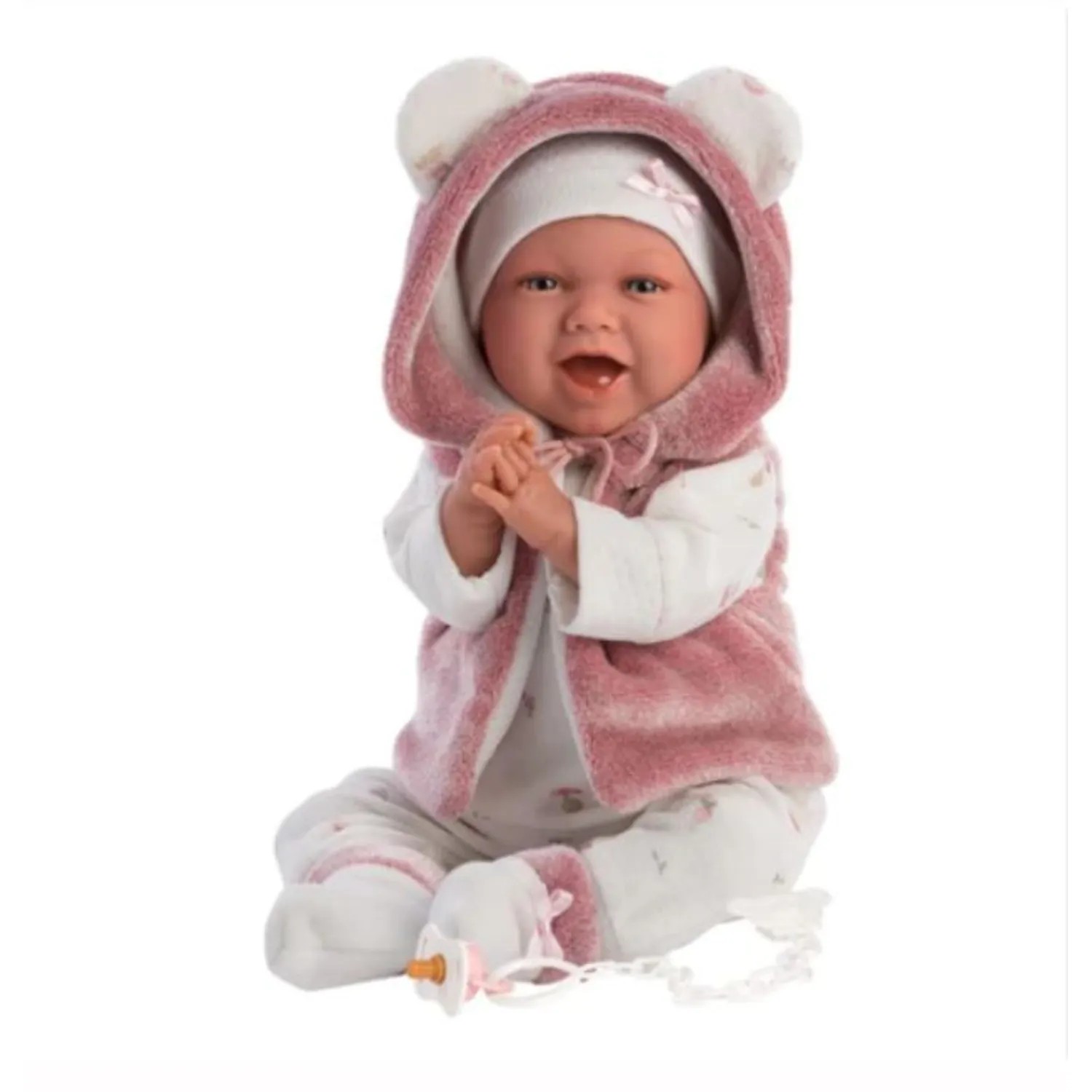 Las muñecas Llorens son fabricadas íntegramente en España usando materiales de primera calidad, creando muñecas que inspiren la felicidad de los niños. Mimi sonríe porque el encanta su cojín de reno y su conjunto a juego. Es una bebé muy feliz.