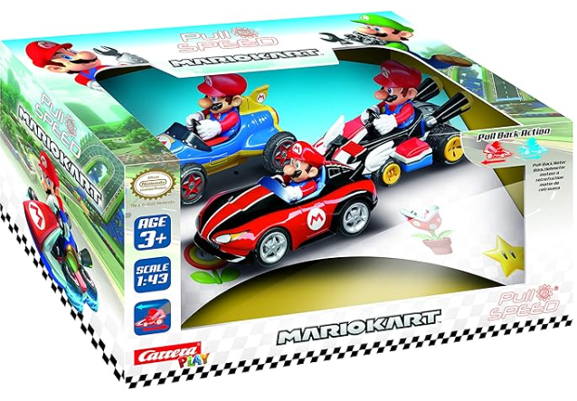 Presiona hacia abajo, tira hacia atrás y suelta Los coches Carrera Pull y Speed son rápidos y divertidos tanto para niños como para adultos El producto oficial de Nintendo Mario Kart es un gran regalo para jóvenes y viejos fans y coleccionistas de Mario Kart Carrera Pull y Speed Modelo #15813016 Mario paquete de 3 incluye Wild Wing Mario, Mario Kart Mario y Mach 8 Mario Diseño auténtico y coche muy detallado en escala 1:43 que proporciona diversión de alta velocidad en todas las superficies Recomendado para niños de 3 años en adelante